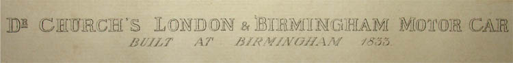 “Dr Church’s London & Birmingham Motor car built at Birmingham – 1833. Engraved by :- Josiah Allen, Birmingham.” Beamish Museum. 2012. http://collections.beamish.org.uk/search-detail?item=IRN37747 (26 November 2012).