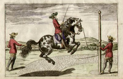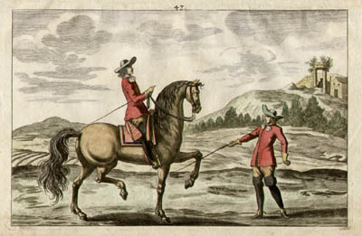 Series of dressage prints in countryside settings. Dressage refers to maneuvers of the horse in response to body signals by the rider, including hops, leaps and trotting in place.