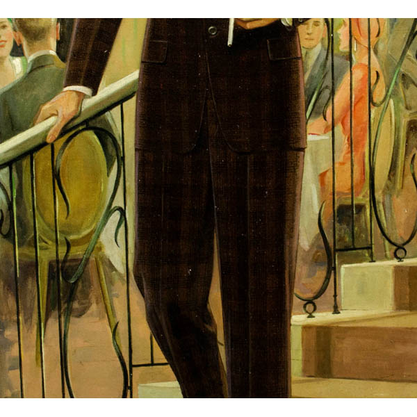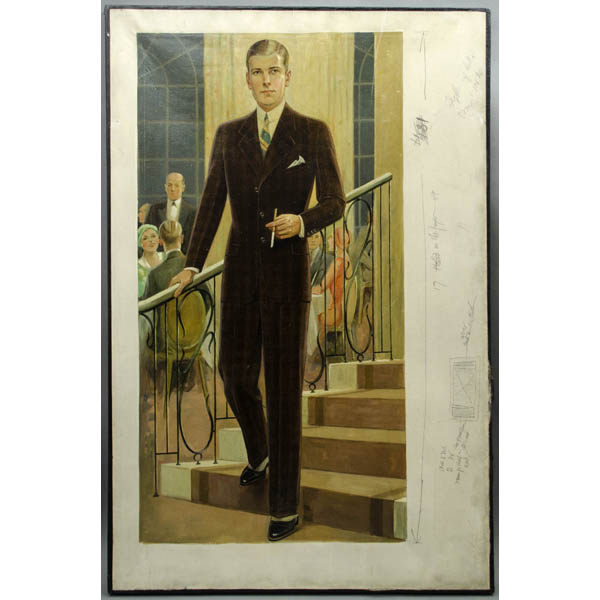 Edmund Magrath was an American portrait painter and fashion illustrator based in East Orange, New Jersey. Born in Massachusetts, he studied at the Ecole des Beaux-Arts in Paris and Rhode Island School of Design. By the age of 22 he had an exclusive contract with the Sherman & Bryan ad agency, which promoted him to the clothing trade as “pre-eminently the master of a life-and-blood technique. He draws MEN, not manikins. You almost expect them to step down from the canvas with hand outstretched and a quip on the lip, so natural do they look. None of your spineless, nerveless, boneless, bloodless, ‘fashion plates.'” In 1915, a printing trade publication, The Inland Printer, listed McGrath as among “the most skilled and highest salaried artists in the profession” of fashion illustration. In the 1910s, he illustrated high-end full color style booklets distributed to clients of Baltimore clothier Strouse & Brothers; these included a section on historical fashions and another on current styles of men and young men’s clothing. Magrath’s portraits were commissioned by numerous corporate and institutional clients including Bell Telephone, Prudential Insurance, Fireman’s Insurance Company, the New York Board of Trade, New York City Hall Library and Wright Aeronautical. He was a member of the Salmagundi Club and the American Artists Professional League, which awarded him a citation in 1955.