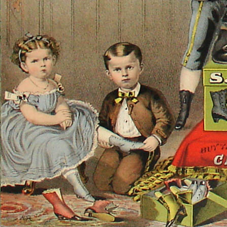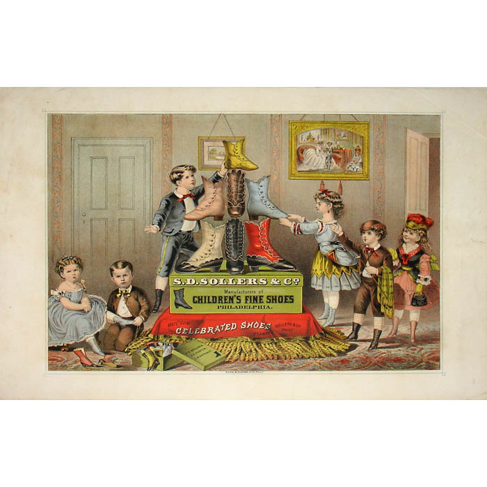 Victorian advertising broadside for S.D. Sollers & Co., a manufacturer of fine children’s shoes and slippers in Philadelphia. Six elegantly dressed boys and girls are posed around a display of oversized high button shoes arranged atop a platform with the company’s name and the slogan “Buy the Celebrated Shoes.” One boy and girl set up the display as two watch on the right. On the left, a kneeling boy helps a little girl try on shoes. Beside them, the lid of an open shoebox on the floor reads “S.D. Sollers. J.C. Austin. J.S. Outcalt.” An example of this print in the collection of the Library of Congress gives the date as 1874.