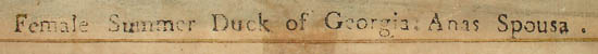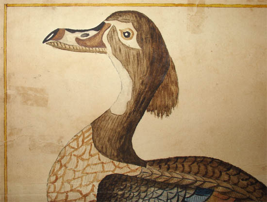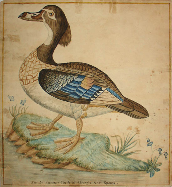 The type of laid paper on which it is painted, as well as the style of execution, indicate that the watercolor was executed in the late 18th century. This would have been after the duck was given the scientific name Anas sponsa by Linnaeus in 1758 (incorrectly spelled “Spousa” on the painting itself ).