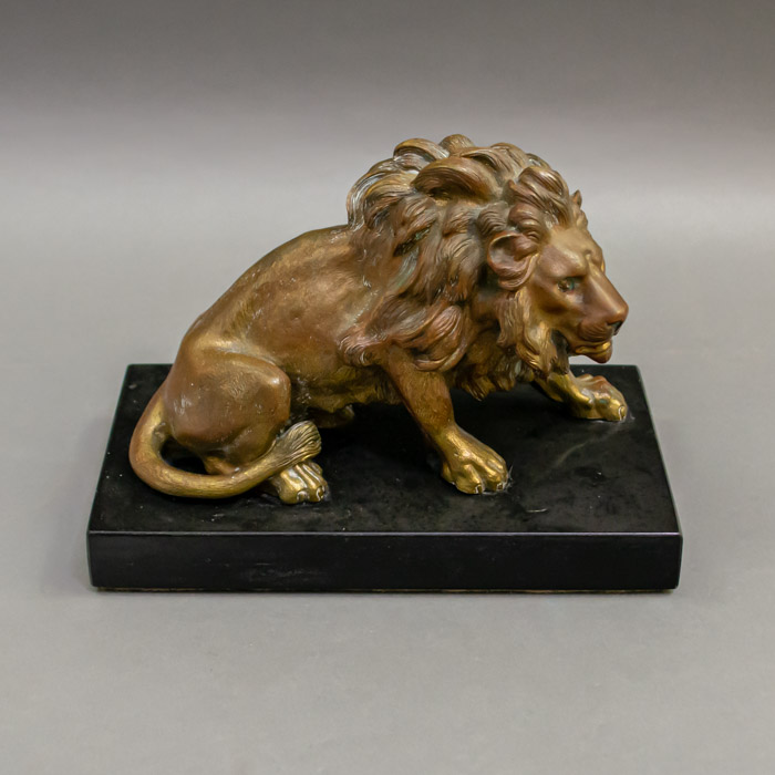 A bold figurine of a crouching lion with fierce expression. Gilt metal with painted highlights on eyes and mouth. Mounted on black marble base.