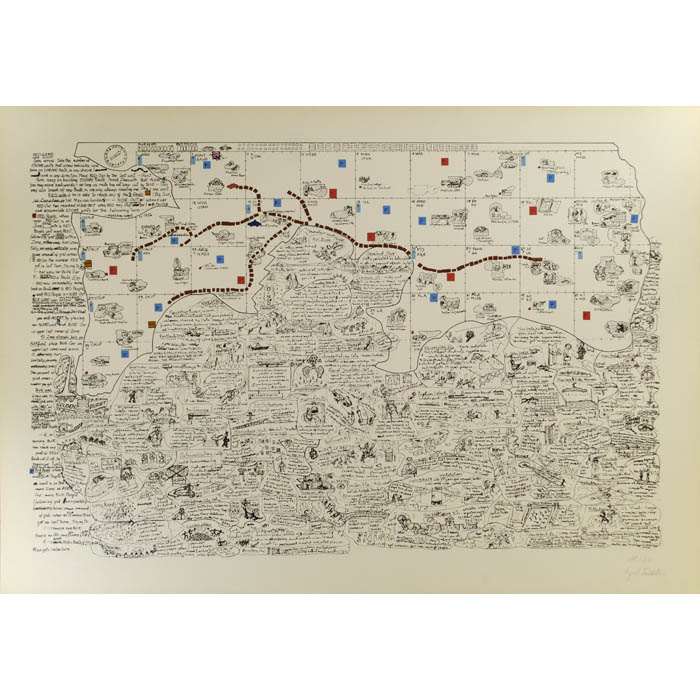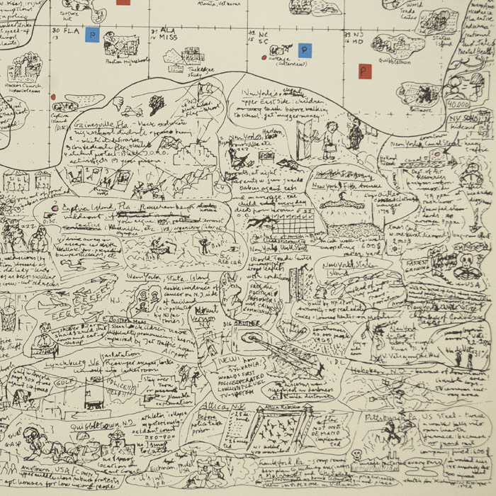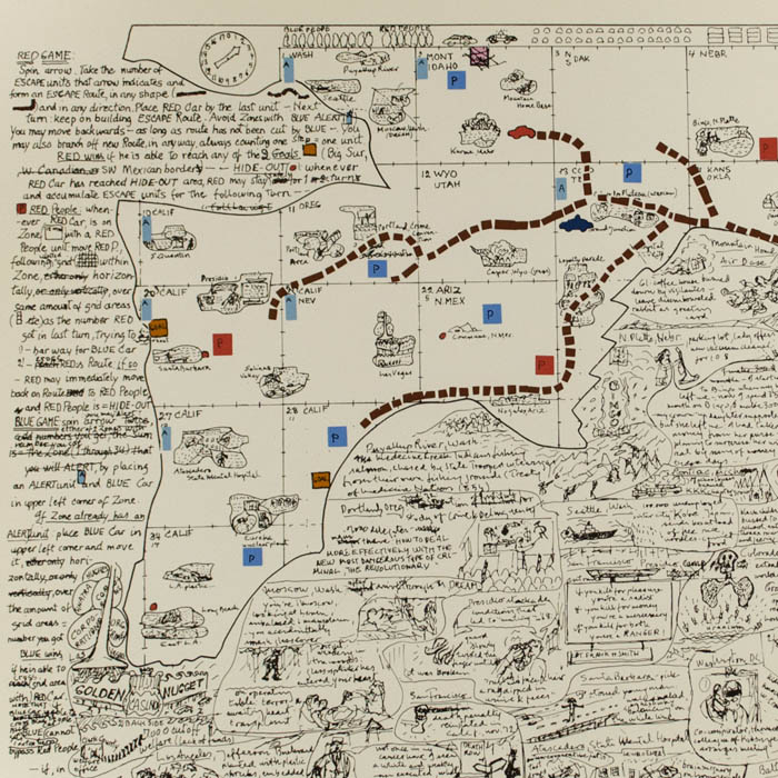 Screenprint in the form of a pictorial map of the United States, part of a series of satirical political works made by artist Öyvind Fahlström in the 1970s that combined maps, board games, and the iconography of comics. The print is based on Fahlström’s original drawing in acrylic and India ink on vinyl paper that he made in 1972. Conceptually and stylistically, it is a logical extension of his interest in combining text and images and is among numerous designs for board games that he drew as a Dadaist commentary on the excesses of capitalism and the politics of the Vietnam War era. Kidnapping Kissinger is often cited as one of the key works he produced in that period. It is loosely composed as an eccentric “map” of the United States with a grid in the top portion, labeled with abbreviated names of states that loosely correspond to their relative locations, through which a path is delineated with tiny squares. The bottom portion consists of a welter of irregularly outlined texts that reference place names and events and incorporate doodle-like drawings. The print was published in 1974 in an edition of 100 with 10 artist’s proofs. AP 8/10 is in the collection of the Museum of Modern Art in New York.