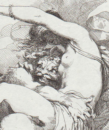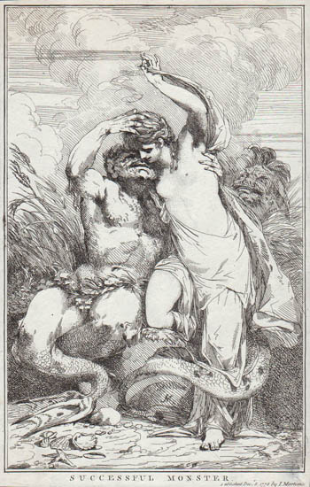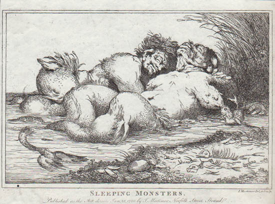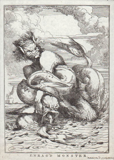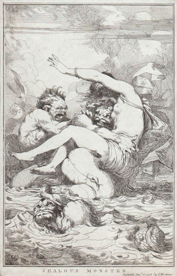 Fifteen Etchings Dedicated to Sir Joshua Reynolds included a total of four of Mortimer’s sea monster subjects (the fourth was Musical Monster). Many of the works were inspired by Mortimer’s artistic hero, the 17th-century artist Salvator Rosa (1615-1673), including four images of sea monsters (recalling Rosa’s Battling Tritons series), and four of “banditti” (Italian outlaws also depicted by Rosa). Mortimer also adopted some of Rosa’s compositional devices and stylistic flourishes.