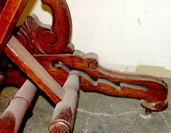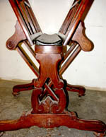 In the standard folio stand, two rectangular lattice sections that support the open book adjust with a ratchet mechanism by turned supports fitting in grooves in the legs. Within this general scheme, the forms vary. Most have flat trestle vasiform supports on either side, generally in baluster silhouette form, with the entire assembly standing on shaped legs ending in casters. Another typical form incorporates a central turned standard on cabriole legs. Regency period examples tend to be more rectilinear, while Victorian stands have shaped parts in keeping with various revival styles such as rococo, baroque, or aesthetic movement. Most folio stands are raised or lowered by a turned support in a ratchet mechanism carved inside the legs, though some have an internal metal ratchet, released by the pull of a cord.
