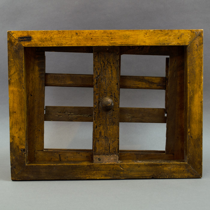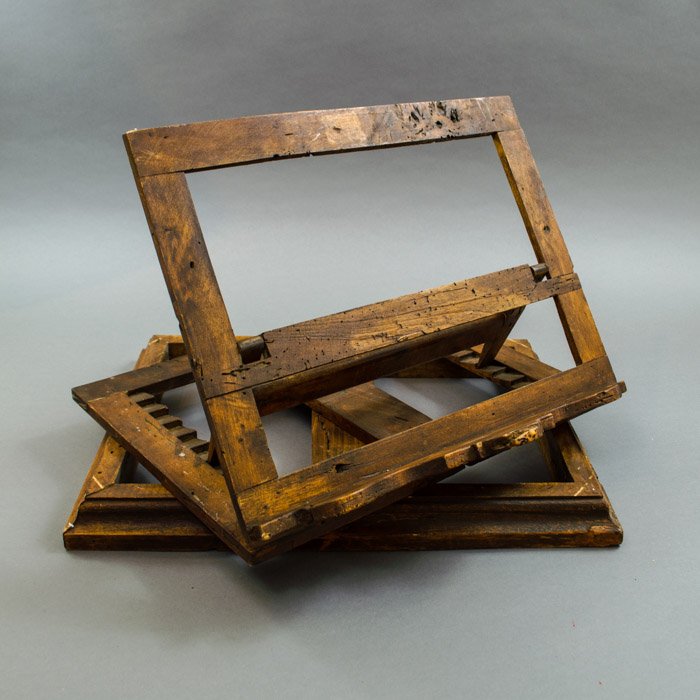 A tabletop adjustable bookstand for the display or reading of a book. Of typical form, having a rectangular backrest with central horizontal cross lattice and a scalloped support at the lower edge, opening and closing on a hinged lower platform, on a molded frame base. The bookstand adjusts to different angles with a ratchet mechanism on the lower platform. The lower platform also rotates 360 degrees like a lazy susan. The bookstand closes at the hinge when not in use for storage or transport. The wood is deliberately distressed to have very early Italian appearance.