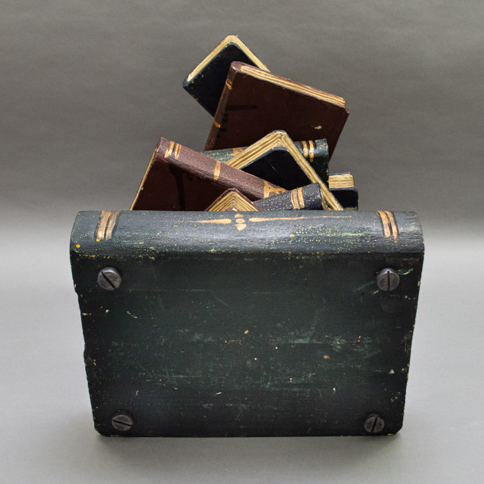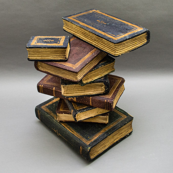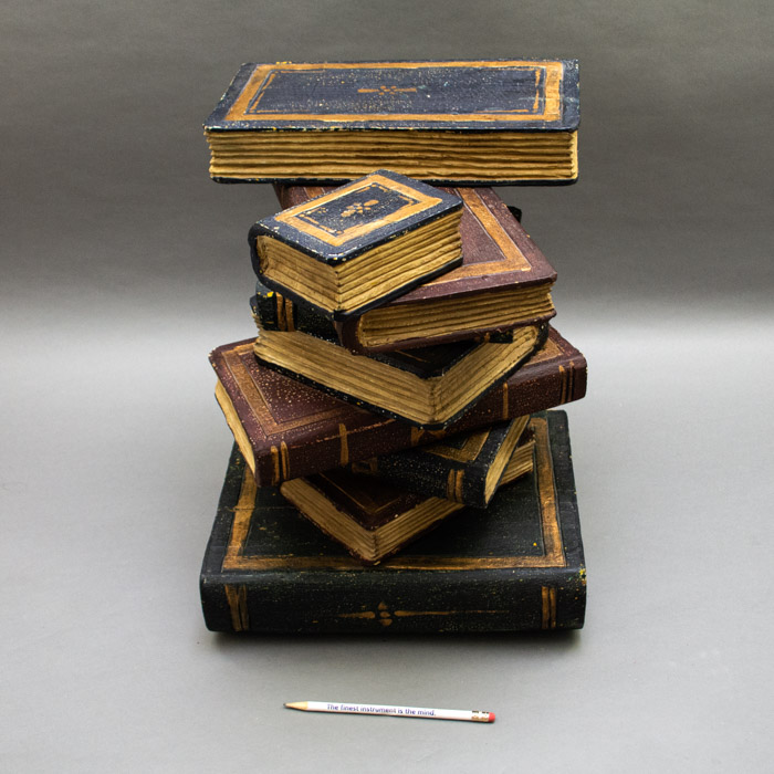 A low table or stand in the form of a carved wooden stack of books. The books have variously colored and designed covers, with Roman numerals on the spines, and with closed “pages” on three sides.