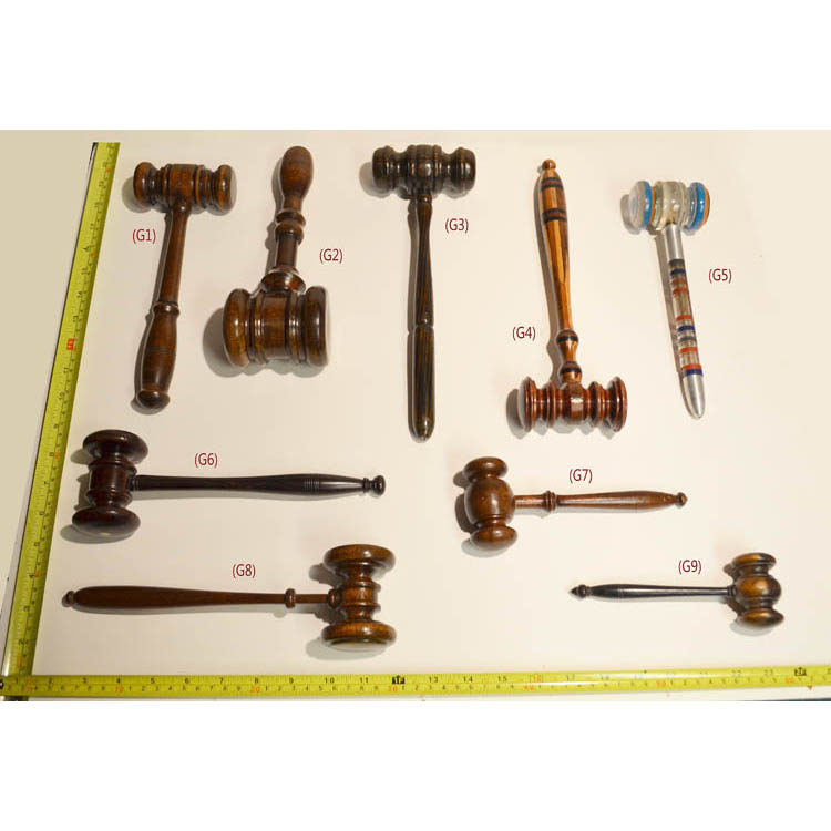 Shown here are a selection of finely crafted gavels in a variety of exotic woods, nicely turned. Prices are as follows: