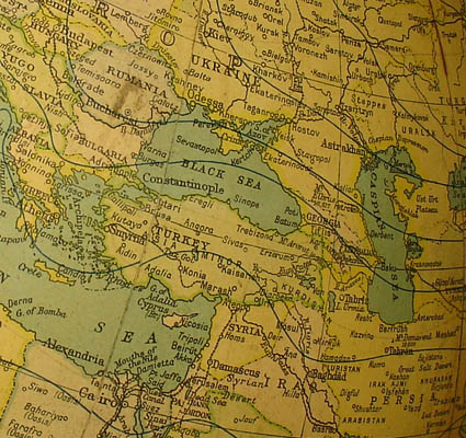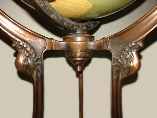 The gores (maps on the globe’s surface) were printed by the London firm of G.W. Bacon, imported and manufactured into the globe by the American school supply firm Weber Costello for school supply company Denoyer-Geppert. Oceans are green (blue which has yellowed over time), geographic entities are various cream and green tones. A reference key indicates railways, ocean currents, isothermal lines and the International Date Line. Leningrad is shown, which dates this globe to after 1924, and Constantinople rather than Istanbul is shown, indicating a date before c. 1930-32. This model Art Nouveau stand was popular for 18-inch American globes, designed and first manufactured at the turn of the 20th century, continuing in use by various globe makers to about 1930.