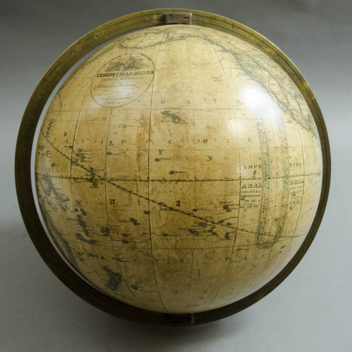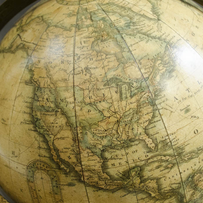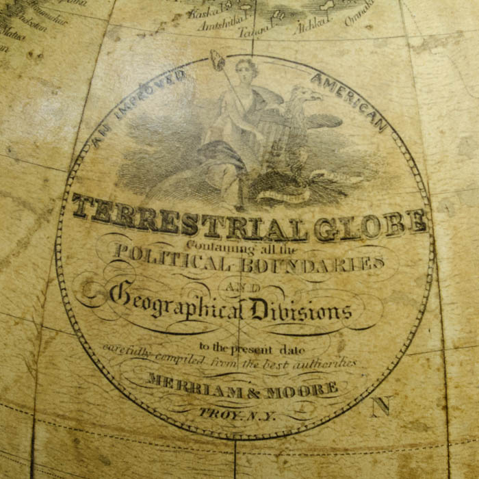 Circular Cartouche, Terrestrial Globe: AN IMPROVED AMERICAN/ TERRESTRIAL GLOBE/ Containing all the/ POLITICAL BOUNDARIES/ AND/ Geographical Divisions/ to the present date/ carefully compiled from the best authorities/ MERRIAM & MOORE/ TROY, N.Y.