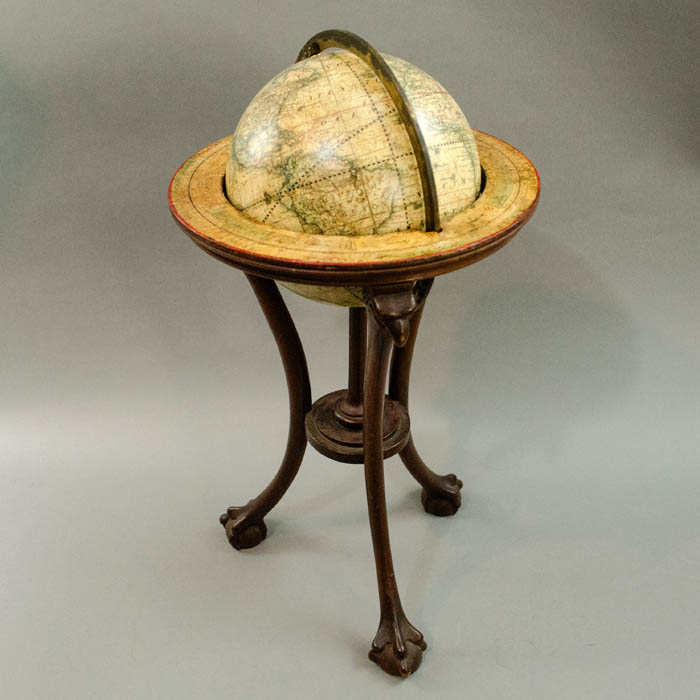 Condition: Globe generally very good, recently professionally restored and revarnished, including restoration of minor abrasions and cracks, now with some light remaining toning, and wear. Horizon band in similar condition but with slightly greater remaining wear. Stand very good with usual wear and aging.