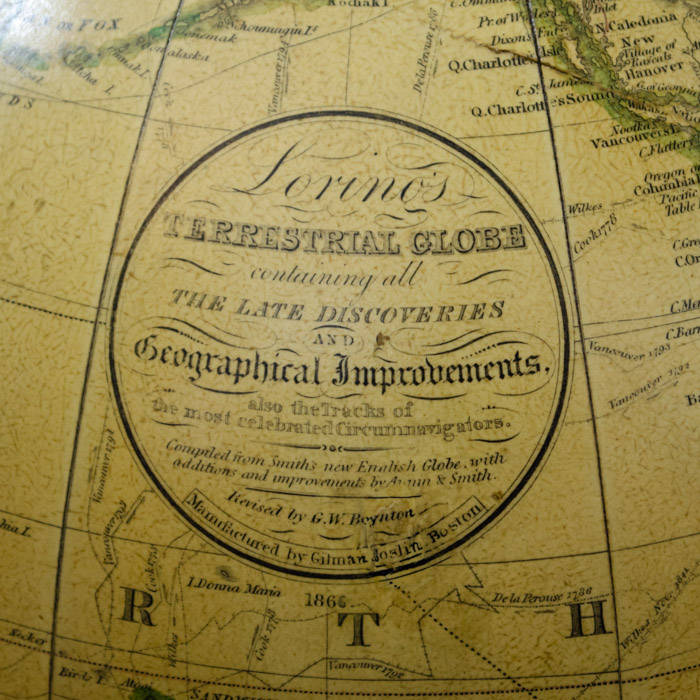 Circular Cartouche: Loring’s/ TERRESTRIAL GLOBE/ containing all/ THE LATE DISCOVERIES/ AND/ Geographical Improvements,/ also the Tracks of/ the most celebrated Circumnavigators./ Compiled from Smith’s new English Globe, with/ additions and improvements by Annin & Smith./ Revised by G.W. Boynton/ Manufactured by Gilman Joslin, Boston/ 1865
