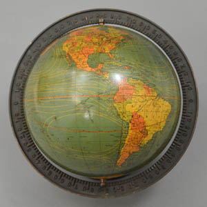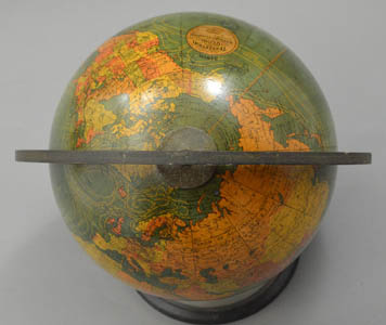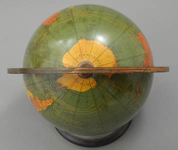 This globe shows present-day St. Petersburg, Russia, as “Leningrad;” therefore, it was made after 1924. Further, it shows Constantinople rather than Istanbul, indicating a date of manufacture before 1930. In addition, it shows Central Australia as a separate territory, limiting its period from 1927 to 1931.