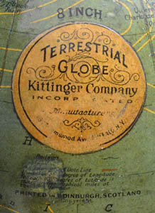 Circular Overlabel: 8 INCH [above label]/ TERRESTRIAL/ GLOBE/ Kittinger Company/ INCORPORATED/ Manufacturers/ 1893 Elmwood Ave., BUFFALO, N.Y./