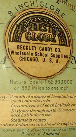 Round Cartouche (overlabel): 8-INCH GLOBE [above overlabel]/ TERRESTRIAL/ GLOBE/ BECKLEY CARDY CO./ Wholesale School Supplies/ CHICAGO, U.S.A.