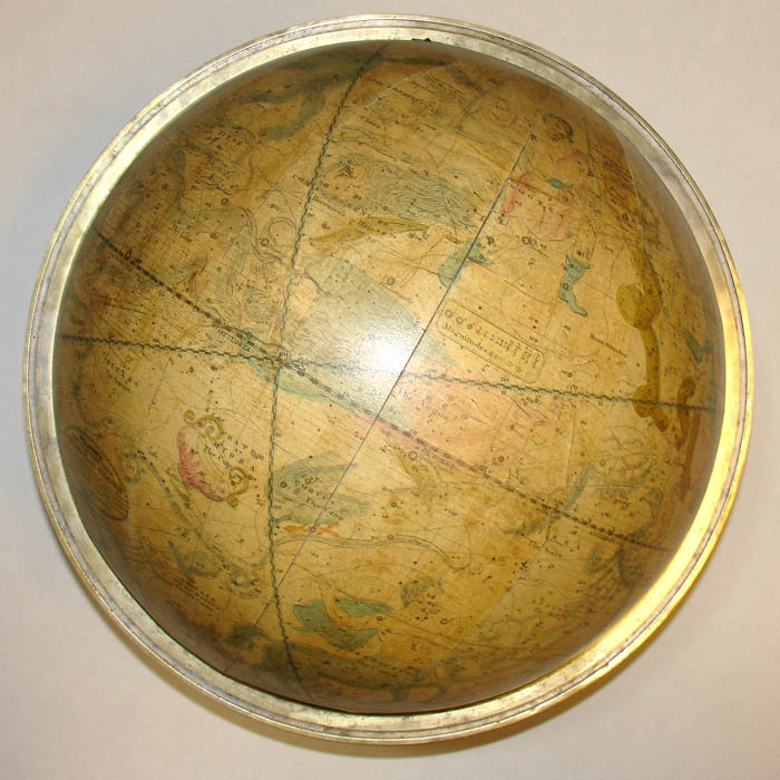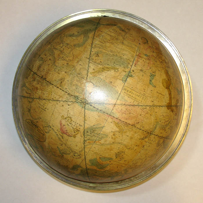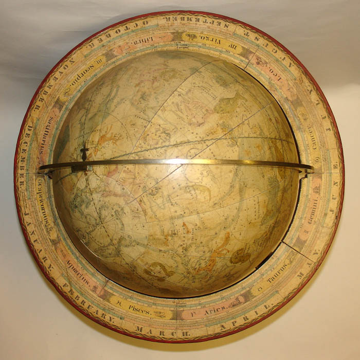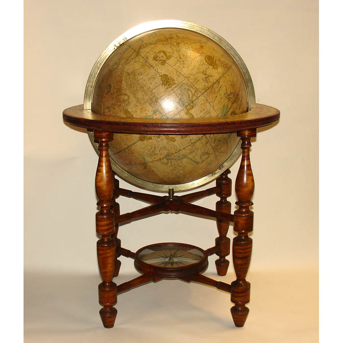 Condition: Generally very good, recently professionally restored and revarnished, with the usual remaining expected light toning, wear and restorations to minor scattered cracks and abrasions. Overall retains a golden antique tone with brightly colored constellations. Stand generally very good with the usual wear and shrinkage. Compass paper later replaced in facsimile.