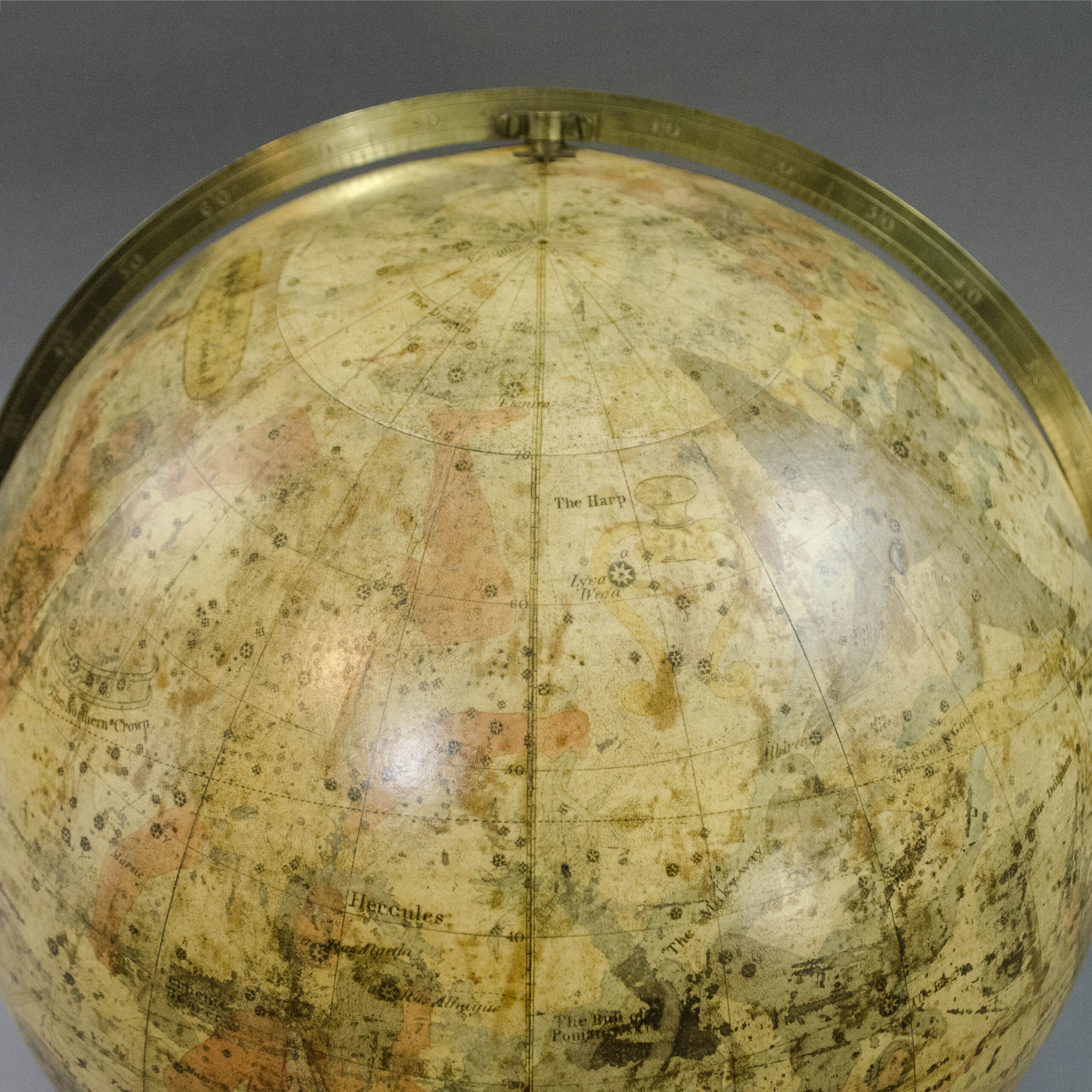 Condition: Generally very good, recently professionally restored and revarnished, with the usual remaining expected light toning, wear and restorations to minor scattered cracks and abrasions. Overall retains a golden antique tone with brightly colored constellations. Stand generally very good with the usual wear and shrinkage.