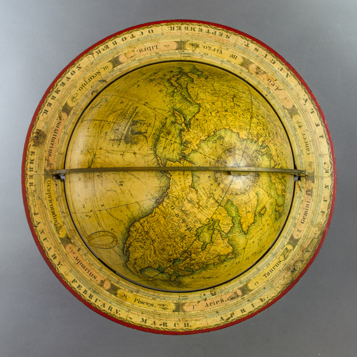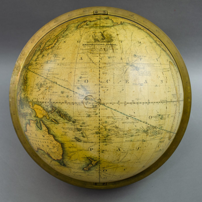 The United States includes is divided into the states east of the Mississippi, along with Louisiana, “N’th West Terit’y” north of Illinois, a section labeled Arkansas, a large northern portion labeled “Missouri Ter’y,” with the portion to the south labeled “Internal Provinces.” Australia is labeled “Australasia” and “New Holland” with Tasmania labeled Van Dieman’s Land. Antarctica is labeled Antarctic Ocean and is unmapped, with a couple of areas labeled as having “many islands and fields of ice,” reflecting geographic knowledge at the time. Tracks of explorers are marked with dotted lines, including Cook, De la Perouse, Furneaux, Flinders, and Vancouver. There is a figure-eight analemma in the ocean. The horizon band is concentrically divided by the degrees of amplitude and azimuth, the zodiacal calendar by name and signs, a Gregorian calendar, compass points, and equation of time with an outer foliate border. As is typical for Wilson 13-inch terrestrial globes, the cartouche is surmounted by a highly decorative allegorical figure of Lady Columbia with dividers in her right hand, pointing at a terrestrial globe to her right which is surmounted by an eagle. This image was designed by David W. Wilson — one of James Wilson’s sons — and engraved by Balch, Rawdon & Co., Albany, New York.
