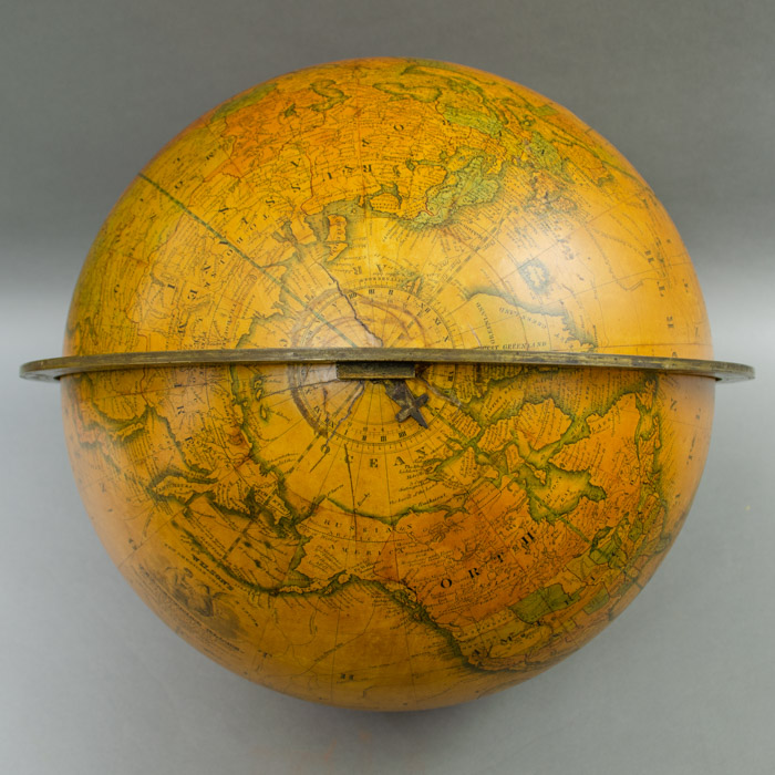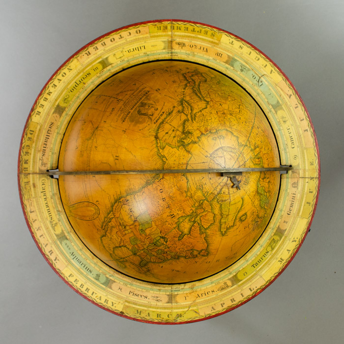 A James Wilson globe should be the cornerstone of any major collection. James Wilson (1763-1855), a Bradford, Vermont, farmer and blacksmith by trade, is the father of American globe making. Wilson was the first American to manufacture globes, having been inspired by European globes he saw at nearby Dartmouth College. A self-taught geographer and engraver, he not only made the globe spheres but designed, engraved and printed the cartographic gores for them. Wilson began his business in Bradford in about 1810 and in 1815 moved to New York State, opening a larger and better-equipped globe manufacturing facility at 110 Washington Street in Albany. In 1817, his eldest son Samuel joined the business and the following year, his son John became a primary partner with his father. Another son, David Wilson worked briefly in the family business, designing a three-inch globe. The firm of J. Wilson & Sons quickly became known as a globe making family enterprise. Cyrus Lancaster, a graduate of Dartmouth College and a school instructor, joined the firm in 1827. Following the deaths of Samuel and John Wilson, Lancaster continued as business manager, and two years later became a member of the family, marrying Samuel’s widow, Rebecca. Lancaster produced a number of globes in Albany under the Wilson name, the last dated one in 1845. The last known dated Wilson globe was published in 1859 by S.R. Gray, a general publisher in Albany, New York.