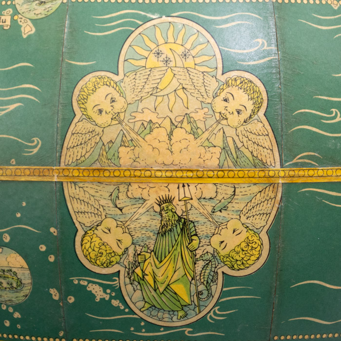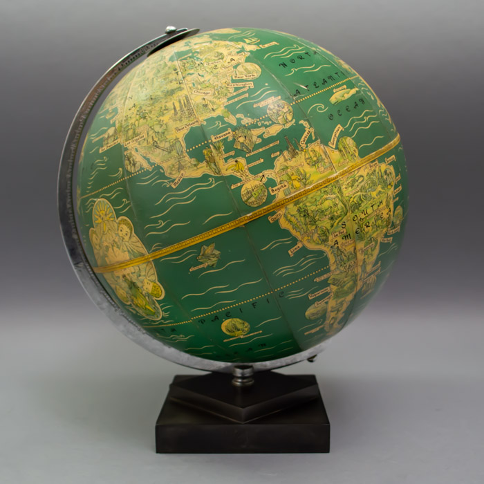 Intended for young students, the globe features simple cartography. Oceans are blue-green, continents and illustrations are in shades of buff, yellow, and green Lakes and major rivers indicated in blue-green, and mountain ranges drawn pictorially. The Tropics of Cancer and Capricorn, Arctic and Antarctic Circles, and the Equator are delineated by rows of dots. The oceans are decorated with pictures of airplanes, ships, and marine creatures. The continents are packed with detailed line drawings of animals, trees, historic buildings, and depictions of the work of various industries, and agriculture around the world. Examples of these illustrations include Niagara Falls, an Aztec pyramid in Mexico, pyramids and the Sphinx in Egypt, and skyscrapers in New York City. Industrial activities and products are labeled within ribbons, as are major cities. There is an additional decorative illustration in the Pacific Ocean with an illustration of Neptune surrounded by four winged cherubs representing the four winds, surmounted by a sun. A rectangular legend explains the International Date Line, which is drawn as a dashed yellow line. There is a mileage scale beneath the cartouche.