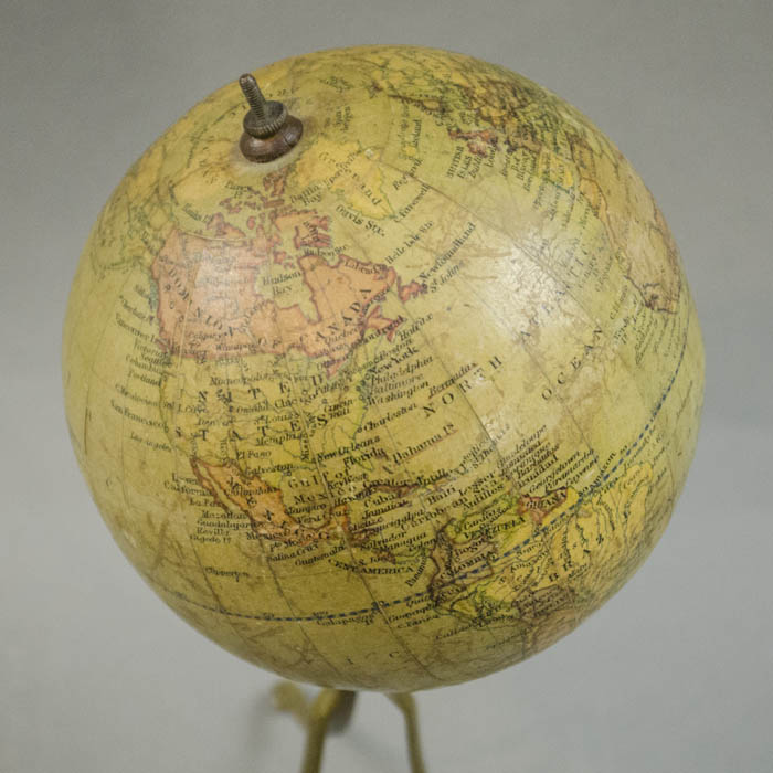 This small Edwardian-era terrestrial globe is set on an inclination arm on a simple tripod brass stand with splayed legs ending in scrolled feet. The cartography is simple, with countries, islands and major cities and bodies of water labeled. The oceans are green (faded blue) and geographic entities are shaded in green, orange, yellow and brown, with heavier outlines. British Commonwealth countries seem to be shaded in orange with red outlines, although so do some others like Mexico and Japan. This globe shows St. Petersburg, Russia, which dates it to prior to 1914, when it was renamed Petrograd. The Equator is marked with a dashed graduated line.