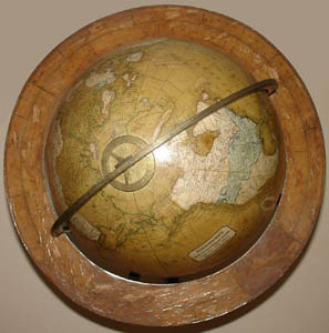 The globe has an extraordinary amount of cartographic detail, including such notations as the locations of native tribes in North America and Africa; the tracks of explorers including Cook, Gore, Vancouver and De La Perouse; and pale divisions between those states that had been incorporated into the United States, reflecting that nation’s borders before the Mexican War and before the boundary was settled between the Oregon Territory and British Columbia — both of which occurred in the 1840s. Alaska is labeled “Russian Territory.” Antarctica is largely unmapped, with only a few fragments of coastline, including Enderby’s Land, discovered in 1831, which helps date this globe to after that year. However, Michigan, which became a state in 1837, is not labeled, possibly dating the cartography to before that time.