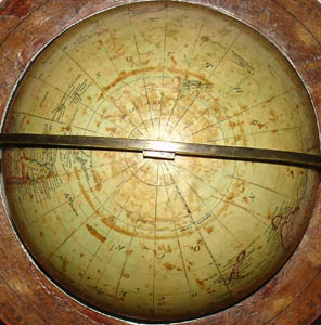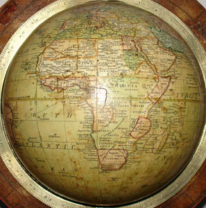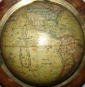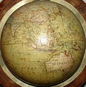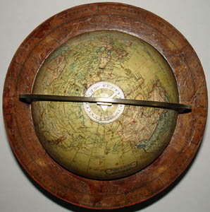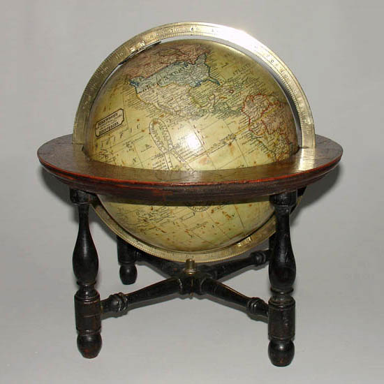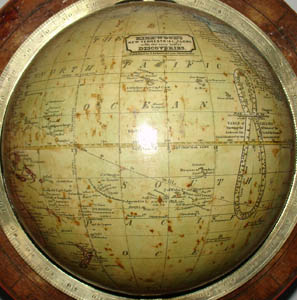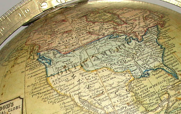 The globe has a lot of cartographic detail considering its size, including such notations as the locations of native tribes in North America and Africa and discoveries of explorers including Cook, Busbe and De La Perouse. The outline of the United States reflects that nation’s borders before the Mexican War and before the boundary was settled between the Oregon Territory and British Columbia — both of which occurred in the 1840s. Antarctica is largely unmapped, with only a few fragments of coastline, including Enderby’s Land, discovered in 1831, which helps date this globe to after that year. However, Michigan, which became a state in 1837, is not labeled, possibly dating the cartography to before that time.