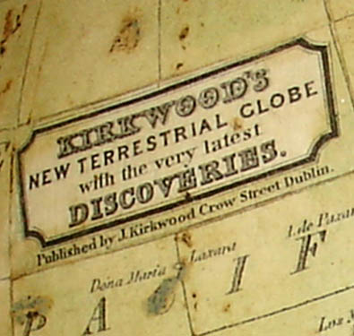 Cartouche: KIRKWOOD’S/ NEW TERRESTRIAL GLOBE/ with the very latest/ DISCOVERIES./ Published by J. Kirkwood Crow Street Dublin.