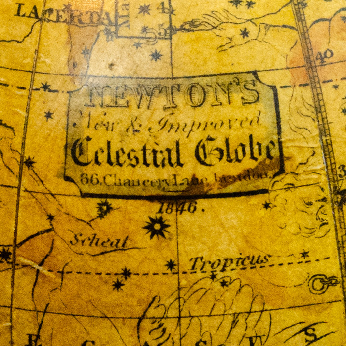 Celestial, rectangular cartouche with rounded inset edges: NEWTON’s/ New & Improved/ Celestial Globe/ 66, Chancery Lane London/ 1846.