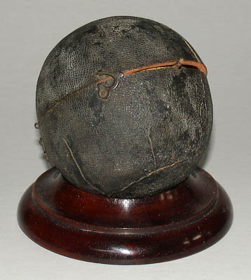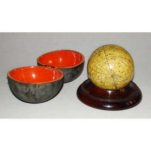 A Cary celestial pocket globe in a fitted fish skin case. They also issued a companion terrestrial globe. The celestial pocket globe has wooden axis pins at the poles and is set within a spherical conforming hinged papier-maché case covered with fish skin and fitted with two hooks and eyes, the interior of the case lacquered orange as issued. The celestial globe is comprised of 12 hand-colored engraved paper gores, the equatorial graduated in degrees, the ecliptic graduated in days showing the names of the houses of the zodiac, the stars shown by magnitude, the constellations labeled and indicated by dotted colored lines (but not shown as figures), with the word PRIZE imprinted on the Arctic circle. As seen in Town & Country magazine in December 2000.