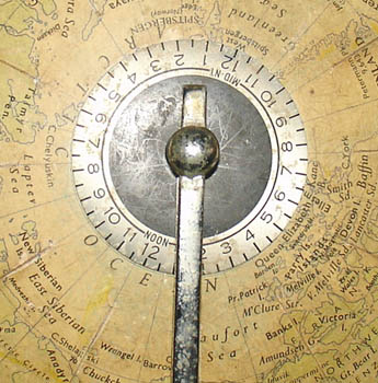The terrestrial globe surmounted by hour circle, within a calibrated chromed half meridian, raised on a square stepped black Bakelite base in the Art Deco style.  This is a physical globe, with both land and ocean areas color coded to indicate elevation above sea level in feet, and below sea level in fathoms.  Shipping routes, labeled with distances in nautical miles, and railways are also indicated.
