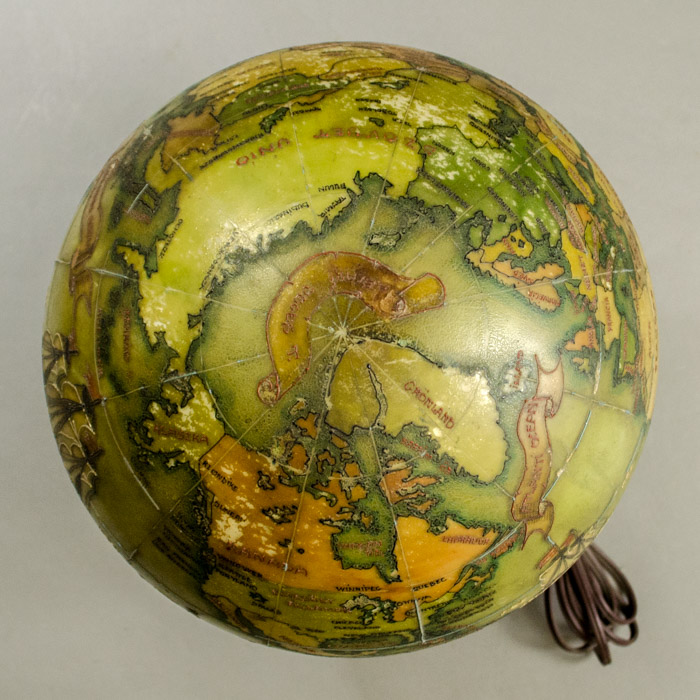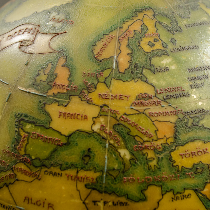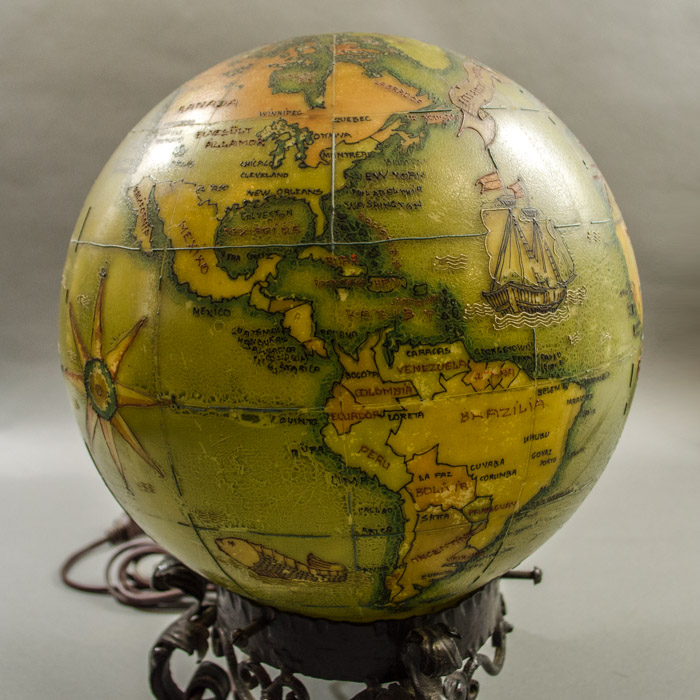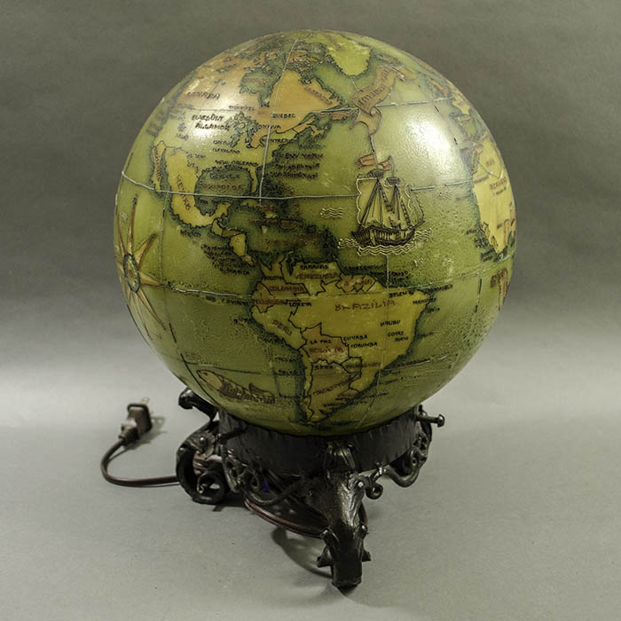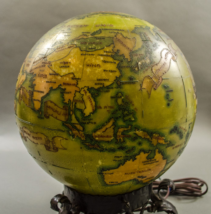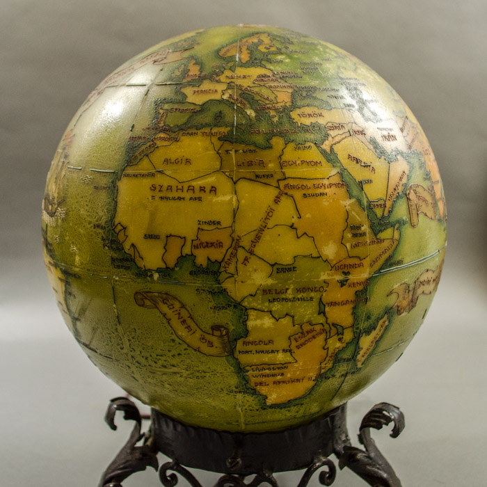 An unusual hand-painted electrified glass terrestrial globe on a rococo cast iron base with place names in Hungarian. Oceans are olive green; countries are yellow, orange, and light green. The painted geographical borders, names, and decorative illustrations are in raised black, brown and green relief lines. The globe is wired to plug into an outlet with a light bulb inside. When turned on, it glows a golden color. Present-day St. Petersburg is called Leningrad, dating it to after 1924; Anglo-Egyptian Sudan is shown dating it to before 1956. However, India is shown but not Pakistan, likely dating it even prior to 1947.