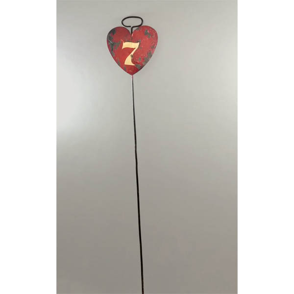 An unusual golf course marker in the shape of a heart, painted red, with the number 7 painted in white on one side to indicate the 7th Hole. The heart is mounted on an iron spike to be inserted in the ground, and surmounted by a loop handle. This marker was probably intended to mark the tee for the 7th hole or to serve as the pin to mark the hole on the green. It is possible that a heart shape was selected for use on a golf course at a resort catering to honeymoon couples.