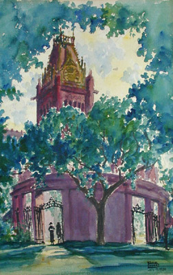 Watercolor of Harvard Yard at Harvard College as it was in 1930, showing a curved wall and wrought iron gate, and the clock tower of a building within, all framed by tall leafy trees. Light spills through the arches of the gate, and passersby walk on the paths.