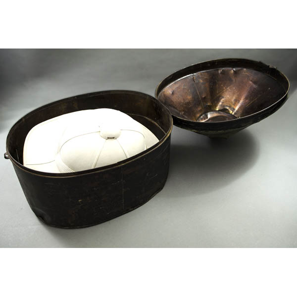 Condition: Helmets very good with the usual overall toning, handling, wear — one a brighter white, one a bit browned and worn overall. Tole box fair, with worn paint, scattered dents and abrasions, oxidation and soiling, and other overall wear; still acceptable and as expected with a utilitarian travel case. Paper label with losses and a bit distressed. Paper tags with losses and tears, now professionally restored.