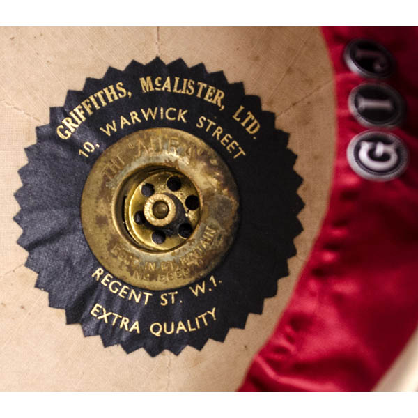 The helmets were manufactured by two different British firms, and have the manufacturers’ labels inside. A pith helmet is a lightweight cloth-covered helmet made of pith (a plant-based material). From the mid 19th to the mid 20th century, they were commonly issued to European military personnel serving in tropical climates to protect them from the sun and physical hazards, and were soon adopted by civilians. They faded from use after World War II.