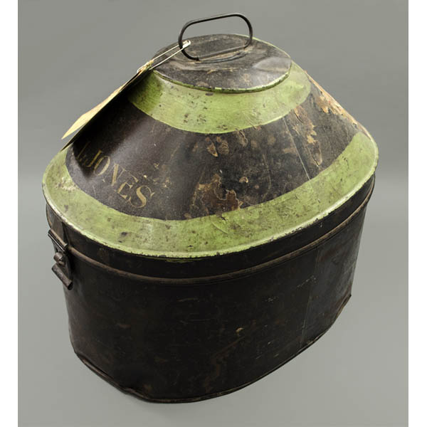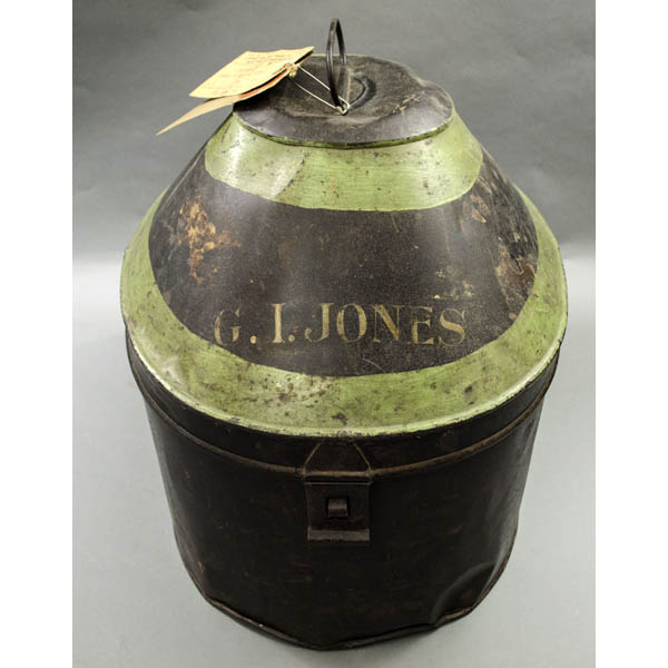 The interior of one of the helmets has a label with Jones’ initials. In addition, Jones’ name is painted in large gold letters “G.I. Jones” on the lid of the box. There is a label adhered to the lid of the box from a U.K. shipping company, Elder Dempster Line, imprinted “Stateroom” and having Jones’ name written in ink. There are also a pair of shipping tags for the hat box from Elder Dempster, one of which has Jones’ Cambridge address handwritten in ink and the notation “Rail Carr. Paid.”