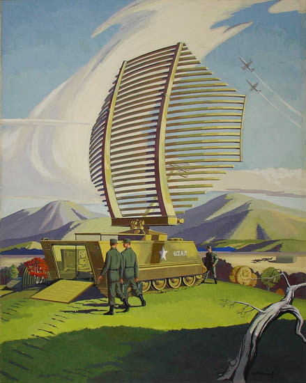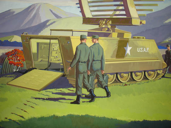 Painting, executed in bold flat areas of color, of a mobile hexagonal radar dish mounted on a United State Air Force tank, its back door opened to reveal radar operating equipment inside. The tank, accompanied by three soldiers, is shown with fresh tread marks atop a grassy hill in a landscape suggestive of the American Southwest. In the distance, two Air Force jets make a sharp ascent and a few others sit outside a hangar on a flat plain. The radar instrument shown was probably produced or proposed by defense contractor, Westinghouse Electric Corporation in the early 1960s.