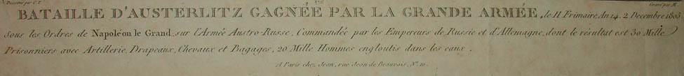 Title and inscription lower margin: Bataille D’Austerlitz Gagnée par la Grande Armée, le 11 Frimaire An 14. 2 Decembre 1805. Sous les Ordres de Napoléon le Grand, sur l’Armée Austro-Russe. Commandée par les Empereurs de Russie et d’Allemagne, dont le résultat est 30 Milles Prisonniers avec Artillerie, Drapeaux, Chevaux et Bagages. 20 Mille Hommes engloutis dans les eaux.