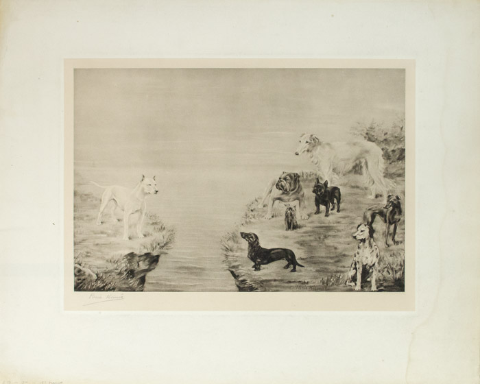 Persis Kirmse was a British artist born in Bournemouth, England, best known for her drawings, paintings and prints of animal subjects, especially dogs and cats. Her sister, Marguerite Kirmse (1885-1954), also an artist, emigrated to the U.S. and was especially well known for her etchings of dogs. Persis Kirmse stayed in Britain, and produced both fine art portraits and illustrations, usually in pastels, sometimes in oils. Some of these were reproduced on calendars and sets of postcards. She also made dog portraits for members of the European aristocracy. She authored and illustrated several children’s books, including a series of animals enacting scenes from Shakespearean plays, which included Shakespeare at the Kennels (1934), Shakespeare with the Pets (1935), Shakespeare at the Zoo (1936) and Shakespeare and the Birds (1938). She also illustrated animal-themed books by Frances Pitt and E.V. Lucas. Kirmse exhibited her work, including a show of pastels at the Art Institute of Chicago in 1916.