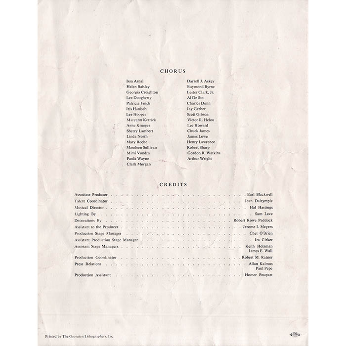 The program is a single folded page. The cover has a photograph of Kennedy with the words “Happy Birthday Mr. President” between a red square and a blue square. Inside is a list of the organizers and the program, featuring leading performers of the day from classical and popular music, dance, Broadway, and movies: Robert Merrill, Jack Benny, Ella Fitzgerald, Jerome Robbins (a dance choreographed by him), Danny Kaye, Henry Fonda, Maria Callas, Elliott Reid, Peggy Lee, Peter Lawford, Marilyn Monroe, Jimmy Durante and Eddie Jackson, Bobby Darin, Henry Fonda, Mike Nichols and Elaine May, and Diahann Carroll. The back cover lists the production credits and chorus members.