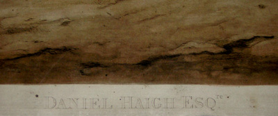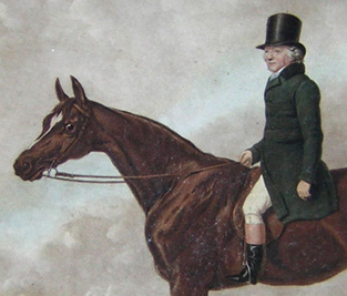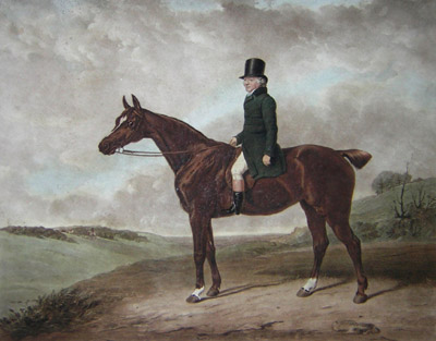 Portrait of Daniel Haigh Esq., formally dressed for the hunt in top hat and blue long topcoat, astride a handsome brown horse. The image is set among rolling green hills in the country with a hunting party in the background left.