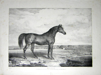 James Ward was an English painter and engraver and one of the great animal artists of the Regency period in England. Prolific and successful, he frequently exhibited at the British Institution and Royal Academy, to which he was elected as a full member in 1811 and continued exhibiting until he was 86 years old. He began his career studying engraving and anatomy, and in 1794 was appointed Painter and Mezzotint Engraver to the Prince of Wales. From 1804, he concentrated on painting. From the 1820s, he was chiefly employed as a painter of horses, although he also depicted dogs and wild animals, typically placing them in dramatic landscapes rendered with vigorous brushwork and strong colors. In 1823-24 undertook a lithographed series of “Celebrated Horses,” that capture the beauty, power, strength, and personality of each horse, and are important early examples of art lithography – these prints come from that series. Ward also produced landscapes, genre and history paintings. His work influenced British artists as well as the French painters Delacroix and Géricault.