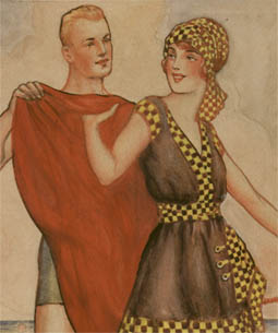 Original illustration art depicting a smiling couple in early 20th century beach attire standing before a seaside backdrop. A handsome blond young man unfurls a red towel or robe for a young woman in a chic black and yellow bathing costume with matching headscarf and boots. This may have been painted as the original for a catalog, magazine cover, or promotional calendar.