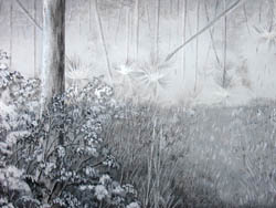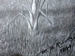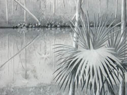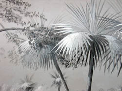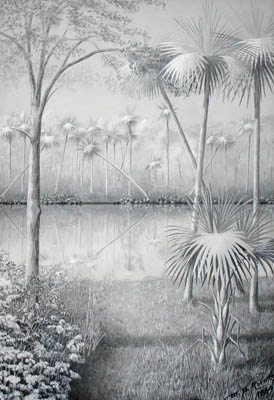 A serene, late 19th century view of a body of water surrounded by palm trees in soft, hazy light that suggests mist rising in the early morning. Skillfully painted en grisaille in tones of black, white, and grey, the work is cleverly composed, playing the straight lines of the palm trunks and their reflections off the gracefully curving shapes of the palm fronds.