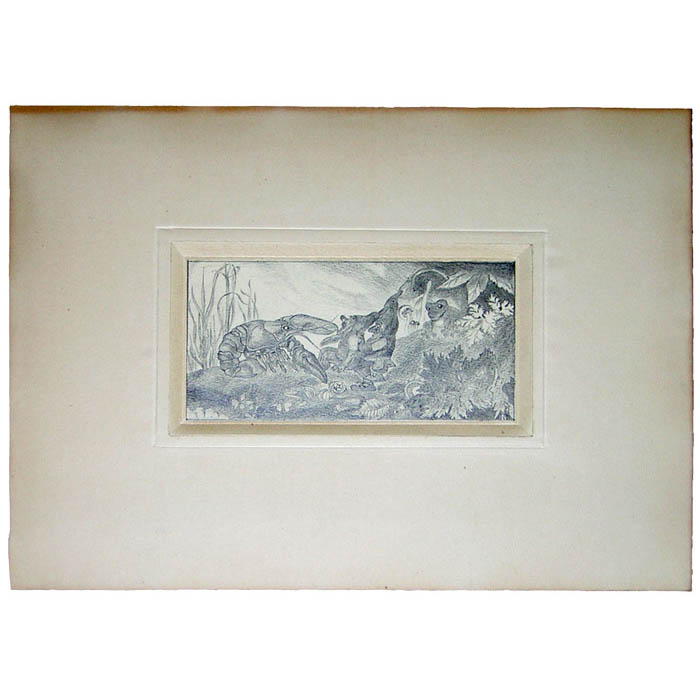 Fine Art, Lobster Pulling Gnome’s Tooth, Antique Drawing, 1908