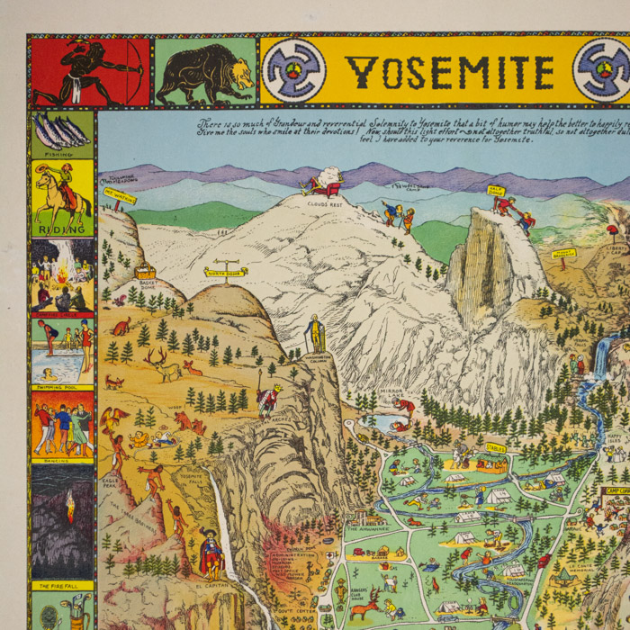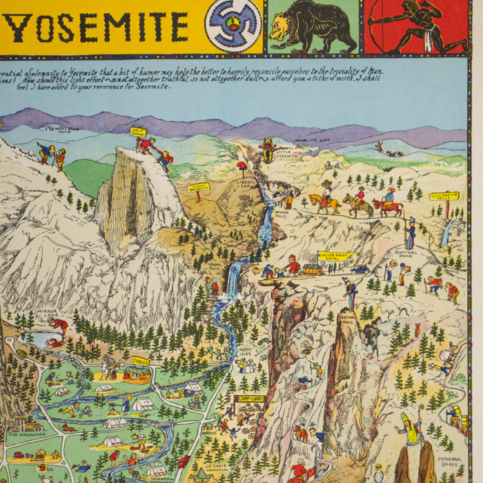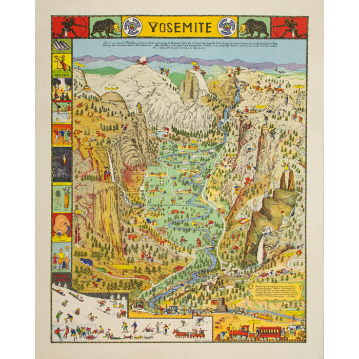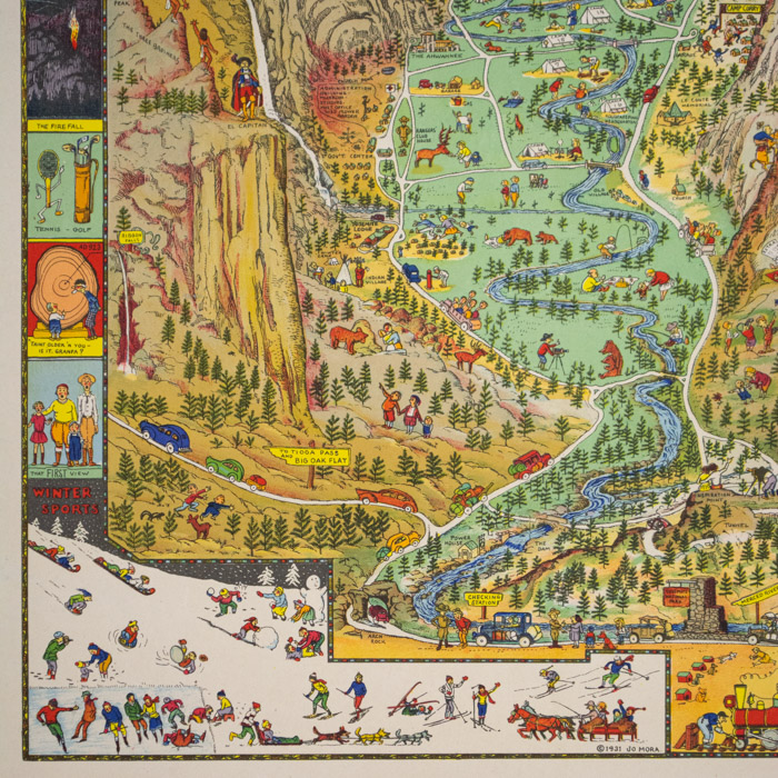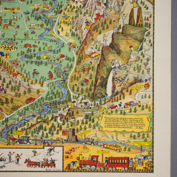 Yosemite was first issued by Mora in color with a copyright date of 1931. It was reissued in a later state, also in color and in the same size in 1941 and 1949 by the Yosemite & Curry Company. These reissues have several alterations including a change in the sign name in the lower left from “To Big Oak Flat” to “To Tioga Pass and Big Oak Flat,” the updating of certain cars to 1940s models, and incorporating color variations. A larger black and white map was also issued in 1931.