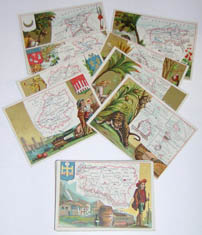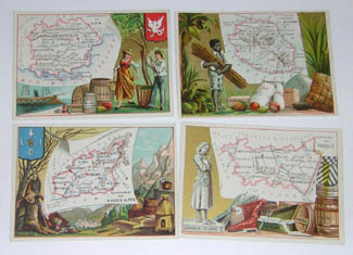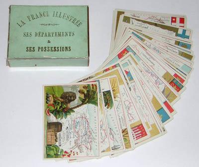 Charming, brightly colored set of educational map cards for teaching French geography. The cards show various regions in France and French colonies of the late 19th century, together with illustrations of local peoples, animals, as well as agricultural and industrial products. The high quality chromolithography includes gilt highlights to the designs.