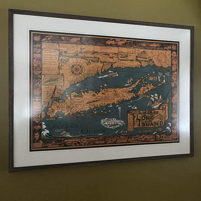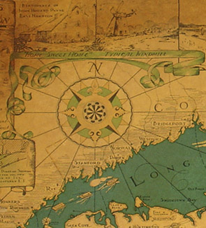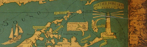 Courtland Smith was an architect in Southampton, Long Island, working at that occupation for a remarkable 70 years, until he retired at age 95. In that capacity, he designed buildings around the world, including many in the Hamptons, where his clean, uncluttered style strongly influenced local architectural standards. Nonetheless, according to Smith’s obituary in the Southampton Press, his best-known work was the pictorial Map of Long Island, initially suggested by his friend Richard “Dick” Foster, the map’s publisher, as a “keep-busy project when he was out of work during the Great Depression,” and which has remained “a steady seller in gift shops throughout Long Island for more than 75 years.” Foster is credited on the cartouche as having compiled the historical information. At the time of Smith’s death, the mayor of Southampton commented that over the years the map has served as a reminder to Long Islanders of the region’s history: “That map has had a significant impact on the development of not only Southampton, but all the other towns on Long Island that it features.”