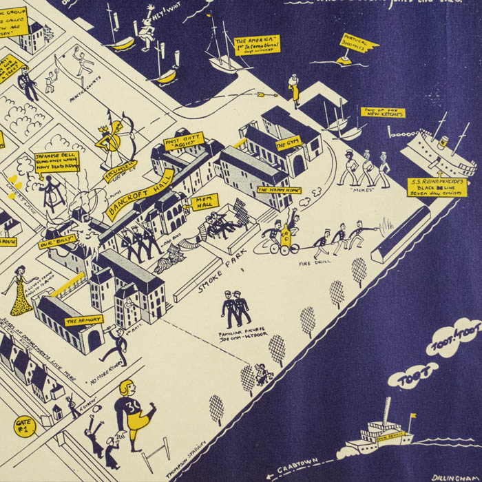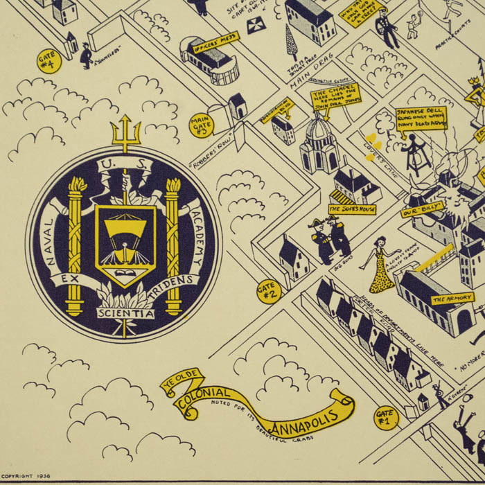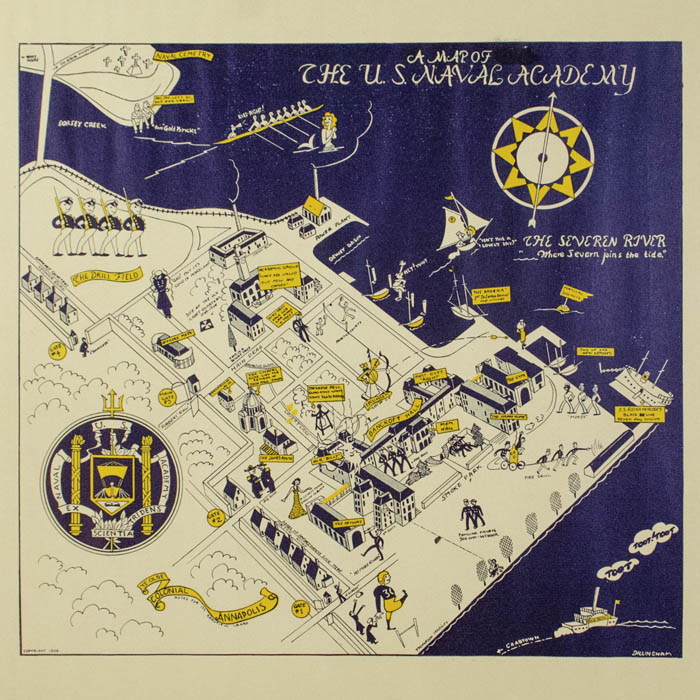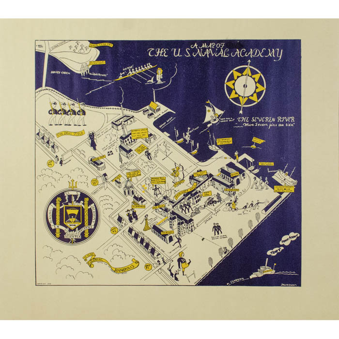 Rare cartoon pictorial map of the campus of the United States Naval Academy in Annapolis, Maryland. It is drawn in a simplified style, with streets, buildings, and waterways labeled, mostly with their actual names, sometimes with nicknames such as “The Happy Home” or “Lovers Lane.” A rendition of an oversized goat labeled “Our ‘Billy'” refers to the USNA team mascot. Small whimsically drawn figures of midshipmen and others typically found on campus are included throughout. Beneath the title in the upper left corner is a compass rose. “The Severen River where Severn joins the tide” is printed in dark blue and includes humorous pictures such as a mermaid distracting the rowers in a passing scull. The academy’s seal is in the lower right corner. The map is printed in navy blue and gold, the academy’s official team colors.